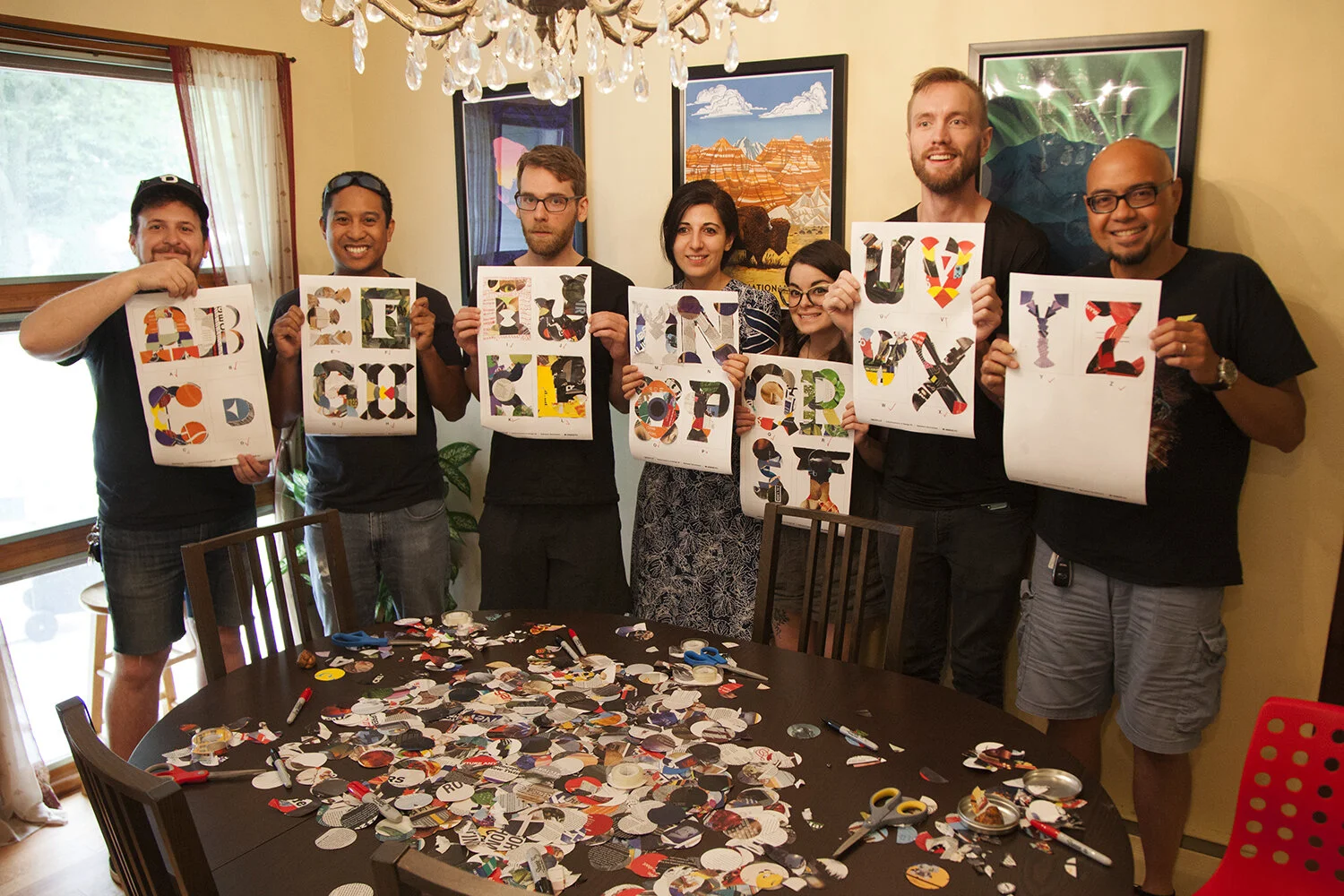 The supplies for Session Two included hundreds of magazine clippings, which were punched into perfect circles, in addition to doubled sided tape, and black and red sharpies. Designers were given the option to cut the circular magazines clippings into halves and quarters (and eventually towards the end of the session, eighths). No ripping allowed. Every two minutes, everyone played a game of musical chairs and moved around the table and subbed in other designers who were on the sidelines (there were ten designers and six chairs). This ensured that each participant added something to every letter in the alphabet. A letter was deemed complete only when all designers unanimously decided to no longer add to it.